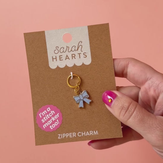 Keep your knitting and crochet projects on point with the Blue Bow Stitch Marker! This playful metal enamel charm in powder blue features a handy circle clasp to easily mark your stitches. When you're not crafting, wear it as a fun necklace or bracelet charm, or clip it onto your bag or garment zipper for a pop of color and charm. Perfect for stitch tracking and style all in one!