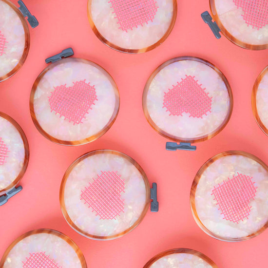 Celebrate your love for crafting with the Cross Stitch Embroidery Hoop French Barrette. Featuring a gently curved round embroidery hoop shape, this clip showcases a pearly white background with a playful embossed pink heart cross stitch design. Perfect for makers, it fastens securely with a classic French barrette clasp, adding a delightful touch to any hairstyle. Made from eco-friendly cellulose acetate for a stylish, sustainable choice.